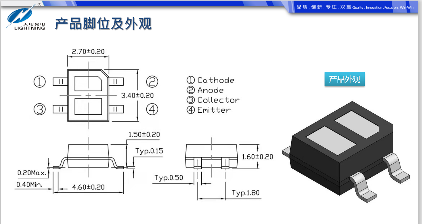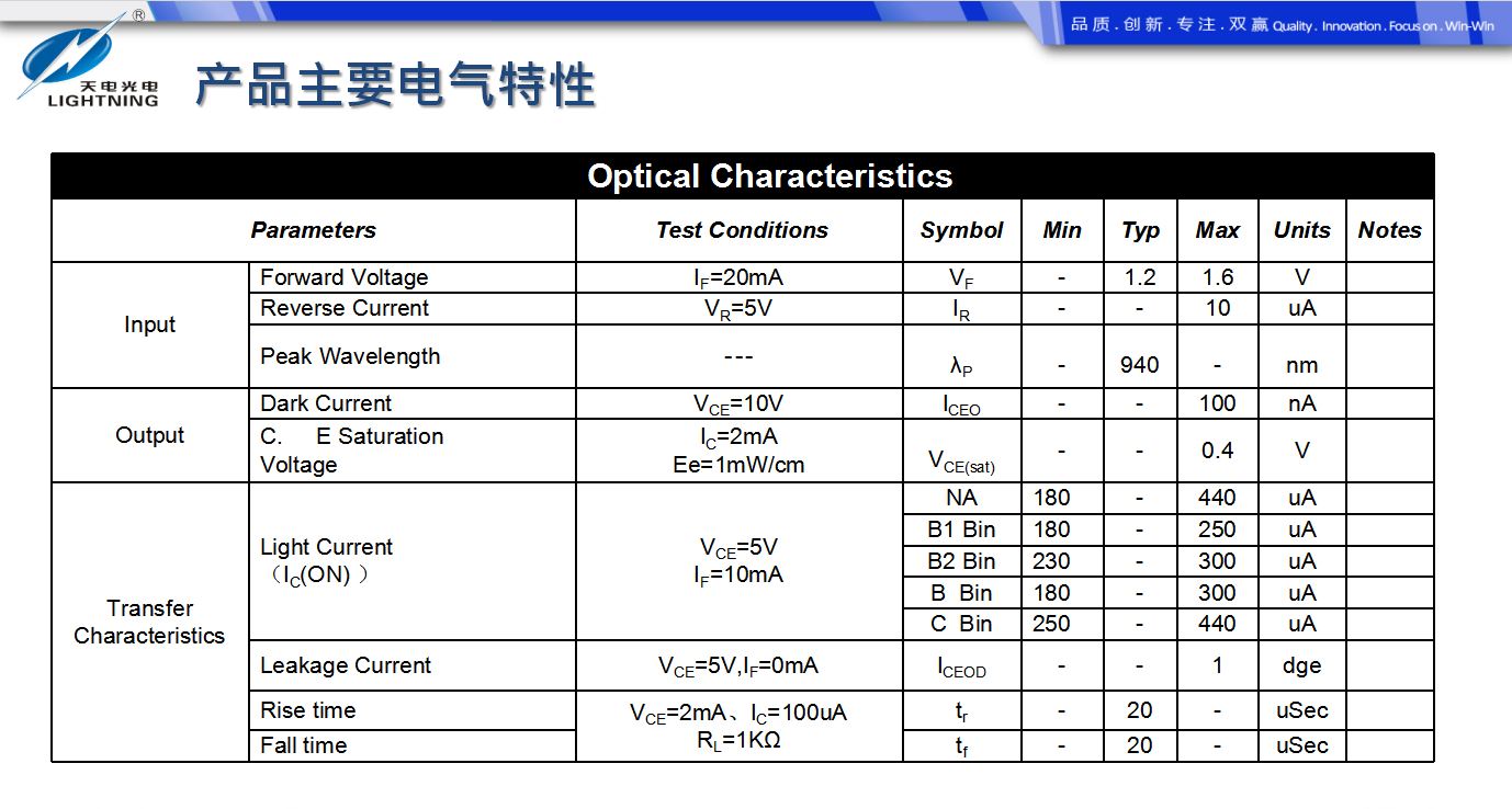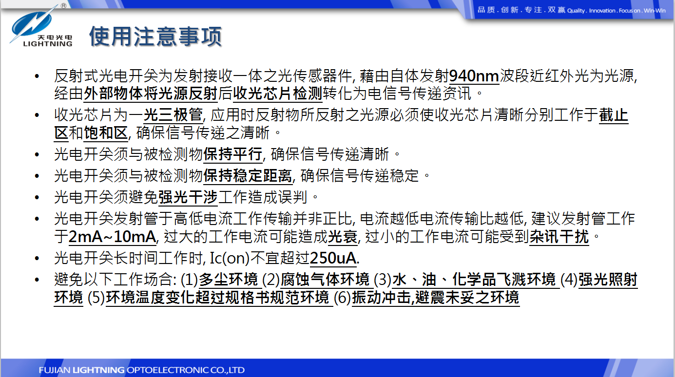 天電TR2DFTRF4-BS03-RTA為小體積SSOP-4貼片反射式光電開關(guān),能替代億光ITR8307-S17-TR8,性能上會(huì)更穩(wěn)定,包括GaAs紅外led發(fā)射器和紅外光敏接收器,藉由自體發(fā)射940nm波段近紅外為光源,尺寸為3.4*2.7*1.6MM,,輸入電流IF50MA,輸出電壓30V,廣泛應(yīng)用于打印機(jī),插卡機(jī),感應(yīng)水龍頭,感應(yīng)馬桶,烘手機(jī),電腦控制設(shè)備,相機(jī),VCR;具有高靈敏度,反應(yīng)速度快,封裝小薄的特點(diǎn),避免以下工作場(chǎng)合: (1)多塵環(huán)境 (2)腐蝕氣體環(huán)境 (3)水、油、化學(xué)品飛濺環(huán)境 (4)強(qiáng)光照射環(huán)境 (5)環(huán)境溫度變化超過規(guī)格書規(guī)范環(huán)境 (6)振動(dòng)沖擊,避震未妥之環(huán)境?