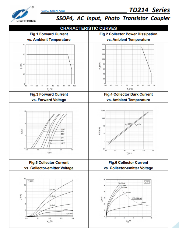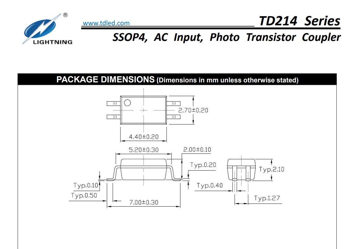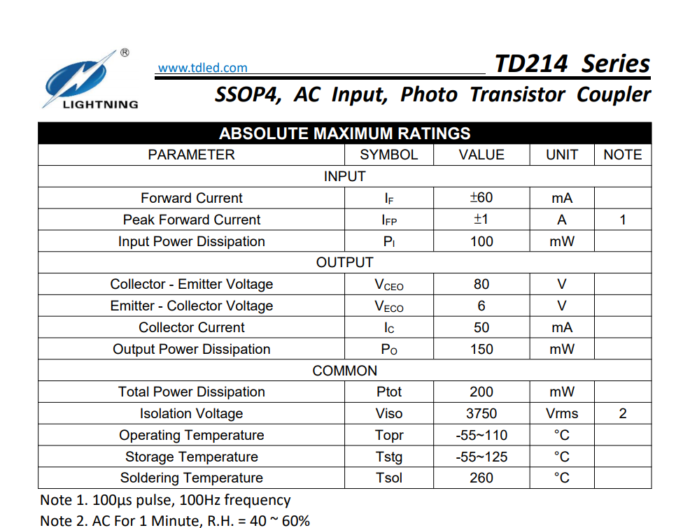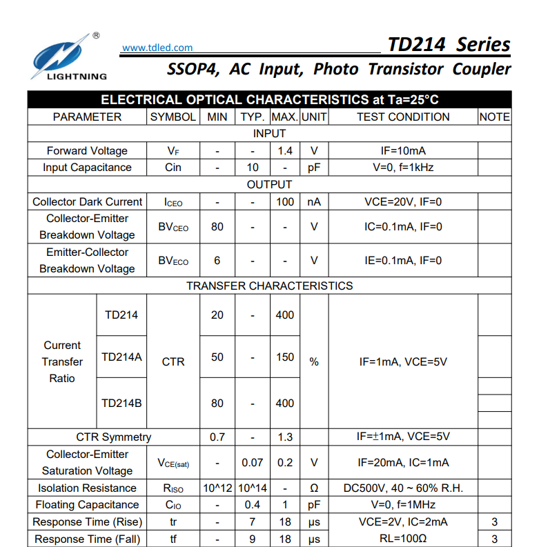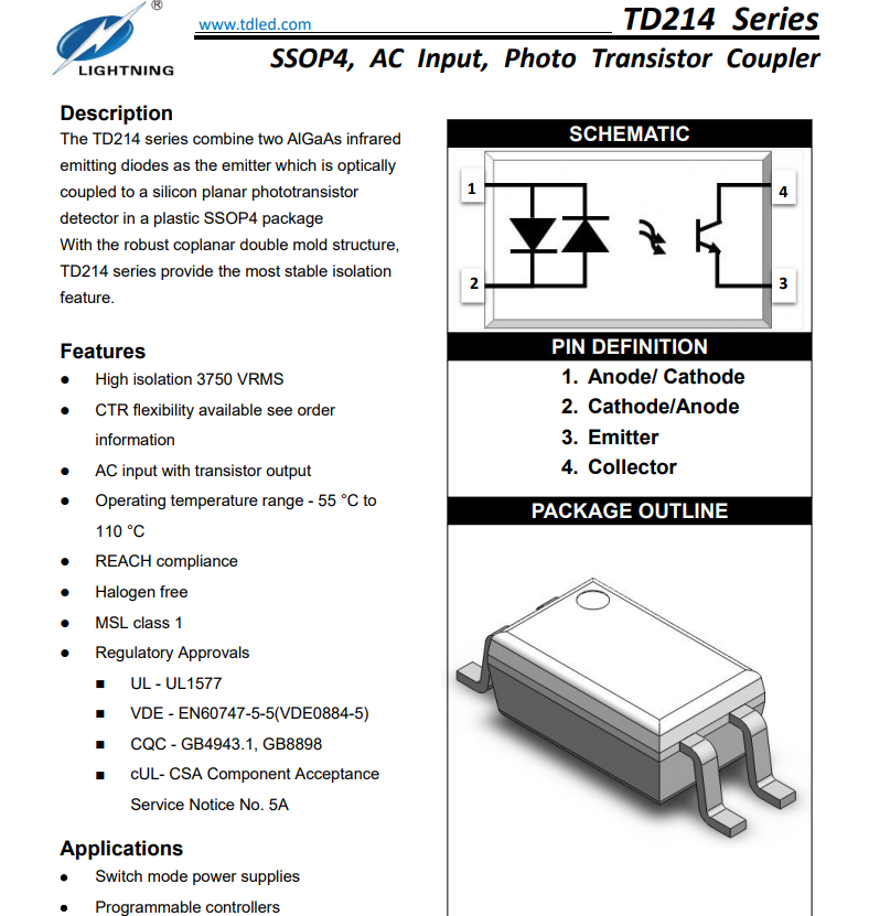 天電TD214屬于SSOP4交流輸入三極管雙向光耦,小體積4.4*2.7*2.1MM,耐壓3750VRMS,輸出電壓為80V,輸入電流IF60MA,工作溫度:-55℃TO 110℃在使用性能上能替代億光EL3H4,光寶LTV-214,兆龍CTH214,夏普PC3H3/3H4,東芝TLP280/284/292/290,冠西KPS2805,瑞薩PS2805X-1/2815X-1/2865X-1,安華高ACPL-214,仙童FODM214,威世VOS627,CTR值分為A檔50-150%,B檔80-400%;廣泛的運(yùn)用于開關(guān)電源,智能電表,工業(yè)控制,測(cè)量?jī)x器,辦公設(shè)備(復(fù)印機(jī)),家用電器(空調(diào),風(fēng)扇,熱水器);?