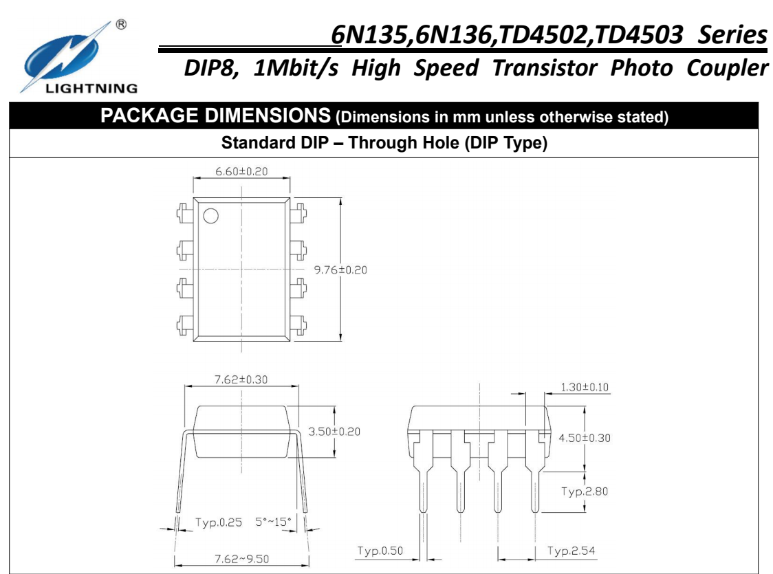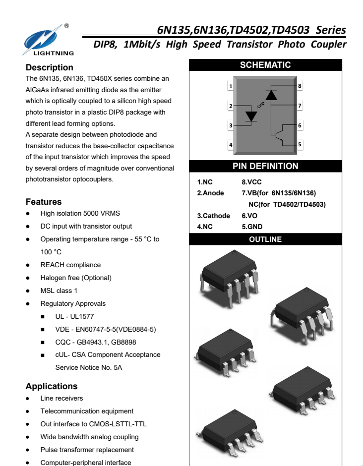 天電6N136屬于單通道八個(gè)腳高速光耦,速率在1Mbit/s,輸入電流IF25MA,輸出Vcc為-0.5-30V,耐壓5000VRMS,工作溫度:-55℃TO 100℃;尺寸為:9.76*6.6*3.5MM, 由一個(gè)850nm波長(zhǎng)的AlGaAs LED 光耦合到高速光電探測(cè)器晶體管組成,在使用性能上能替代夏普6N136和PC957LONSZOF,億光6N136.兆龍6n136, 東芝TLP550/551/559/651/750/751//759,安華高HCPL-2502/2503/250L,仙童6N136,威世SFH6136/6N136;瑞薩PS8501/8502/8601/8602, 封裝的類型分為貼片SOP8和插件DIP8,廣泛的應(yīng)用于:輸出接口至CMOS-LSTTL-TTL,電信設(shè)備,電機(jī)驅(qū)動(dòng)器中的功率晶體管隔離; 詳詢羅生:18925289962