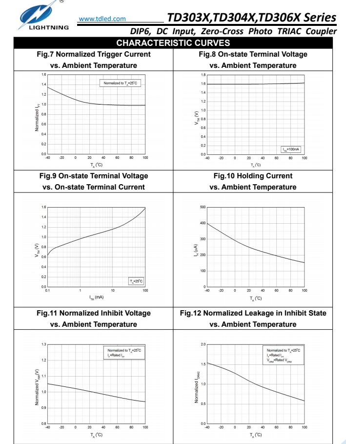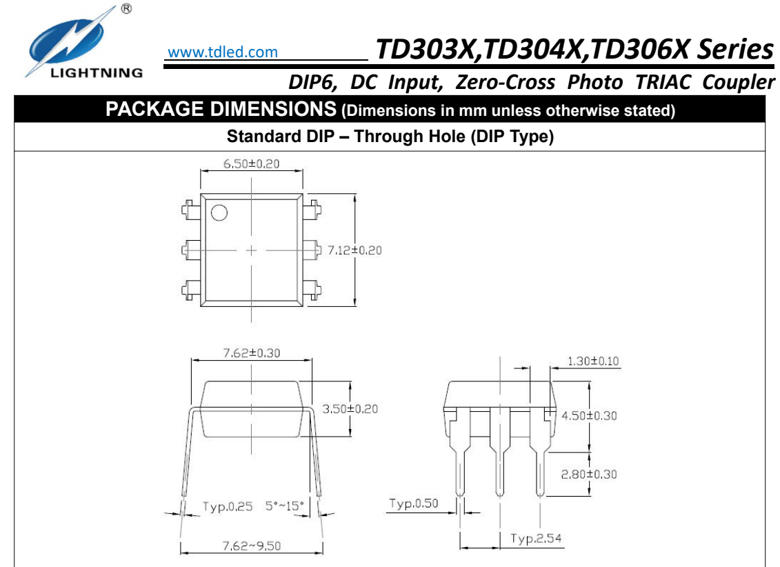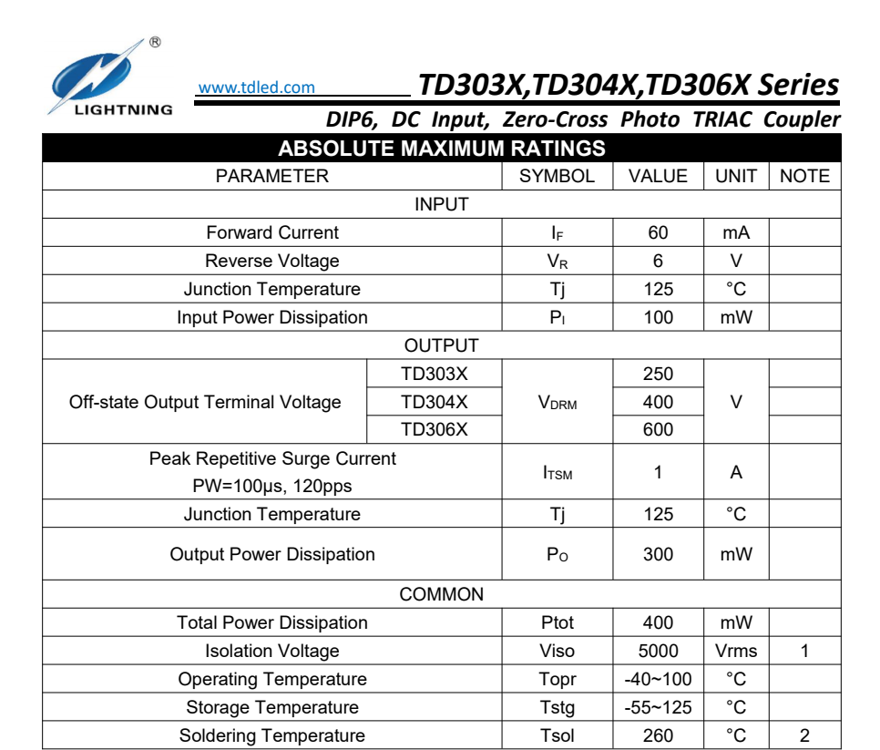 天電光耦TD304X屬于6個腳雙向光可控硅過零觸發(fā)型(ZC)光耦,封裝為SMD6/DIP6,耐壓5000VRMS,輸出電壓為400V,觸發(fā)電流TD3041為15MA,TD3042為10MA,TD3043為5MA;封裝尺寸7.12*6.5*3.5MM,工作溫度:-40℃TO 100℃ 在使用性能上能替代億光EL3041/3042/3043,光寶MOC3041/3042/3043,兆龍CT3041/3042/3043,,夏普S21MD4TV,冠西KMOC3041/3042/3043,東芝TLP304X/561G,仙童MOC3041M/3042M/3043M,可使用雙向可控硅光耦去控制雙向可控硅的導(dǎo)通,用以驅(qū)動電機,燈源等負載,并且可實現(xiàn)調(diào)速調(diào)光等功能。 在控制與驅(qū)動領(lǐng)域,雙向可控硅光耦應(yīng)用非常廣泛;溫度控制,電機控制,白熾燈調(diào)光器,交流電源開關(guān),電磁閥控制等