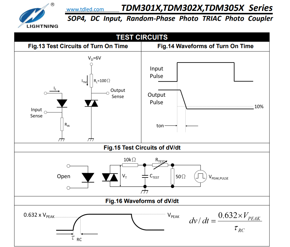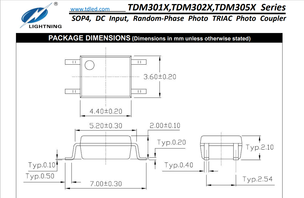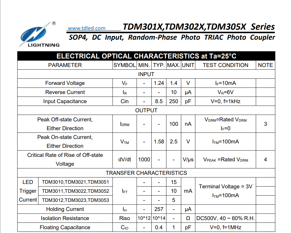 天電光耦TDM305X屬于小體積SOP4雙向光可控硅隨機(jī)觸發(fā)型(RP)光耦,耐壓3750VRMS,輸出電壓為600V,觸發(fā)電流TDM3051為15MA,TDM3052為10MA,TDM3053為5MA.輸入電流為60MA,封裝尺寸為4.4*3.6*2.1MM,工作溫度:-40℃TO 100℃,在使用性能上能替代億光ELM3051/3052/3053,光寶LTV-3051/3052/3053,兆龍CTM3051/3052/3053,東芝TLPTLP160J/165J/260J/265J/267J,夏普PC3SG11TIZ/S2S3AOOF/S2S5AOOF/PC3SH13YFZAH,冠西KTLP160J/165J/260J, 仙童FODM3051/3052/3053,可使用雙向可控硅光耦去控制雙向可控硅的導(dǎo)通,用以驅(qū)動(dòng)電機(jī),燈源等負(fù)載, 并且可實(shí)現(xiàn)調(diào)速調(diào)光等功能。在控制與驅(qū)動(dòng)領(lǐng)域,雙向可控硅光耦應(yīng)用非常廣泛;溫度控制,電機(jī)控制,白熾燈調(diào)光器,交流電源開關(guān),電磁閥控制
