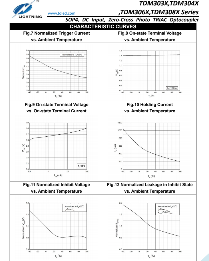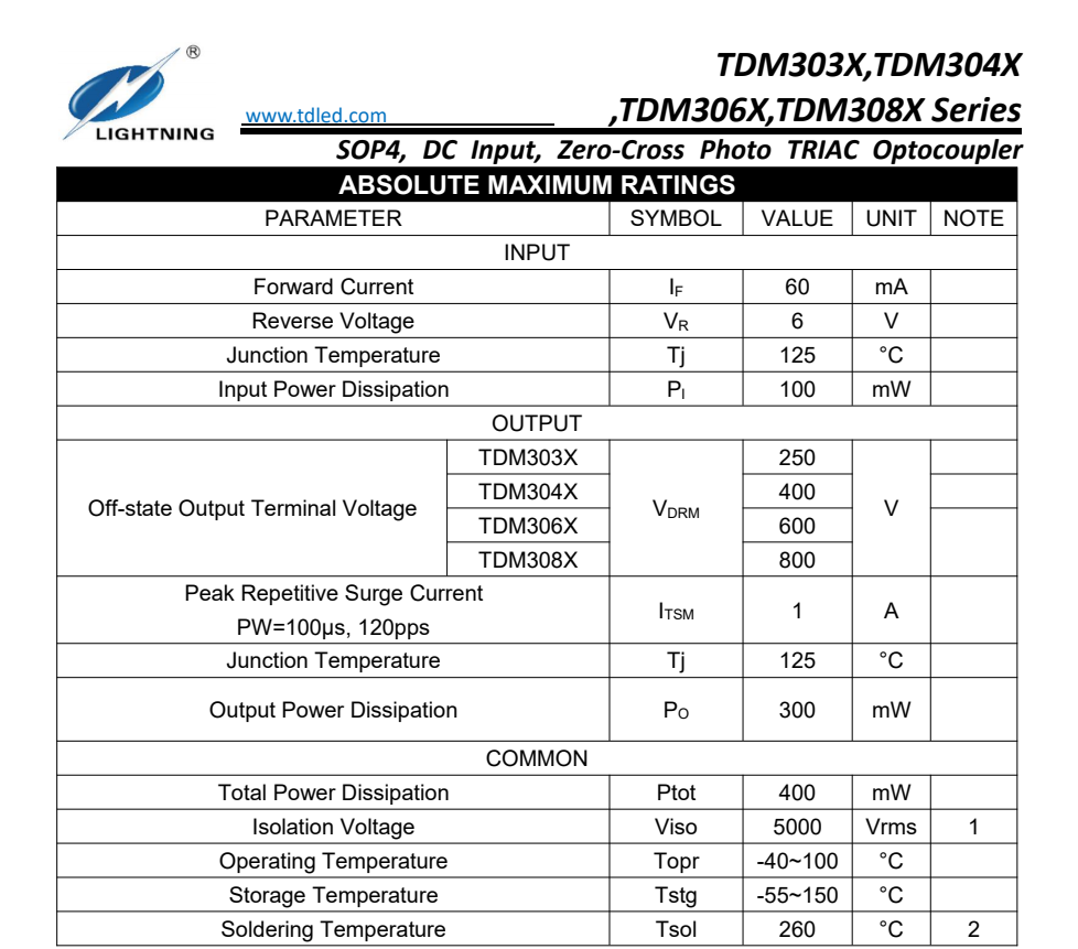 天電光耦TDM306X屬于小體積SOP4雙向可控硅過(guò)零觸發(fā)型(ZC)光耦,耐壓3750VRMS,輸出電壓為600V,觸發(fā)電流TDM3061為15MA,TDM3062為10MA,TDM3063為5MA.輸入電流為60MA,封裝尺寸為4.4*3.6*2.1MM,工作溫度:-40℃TO 100℃, 在使用性能上能替代億光ELM3061/3062/3063,光寶LTV-3061/3062/3063,兆龍CTM3061/3062/3063,東芝TLP168J/163J/261J/161J/166J/266J/268J,夏普PCS3SG21Y/S2S4AOOF/PC3SH21YFZB,冠西KTLP161J/166J/168J,可使用雙向可控硅光耦去控制雙向可控硅的導(dǎo)通,用以驅(qū)動(dòng)電機(jī),燈源等負(fù)載, 并且可實(shí)現(xiàn)調(diào)速調(diào)光等功能。在控制與驅(qū)動(dòng)領(lǐng)域,雙向可控硅光耦應(yīng)用非常廣泛;溫度控制,電機(jī)控制,白熾燈調(diào)光器,交流電源開(kāi)關(guān),電磁閥控制