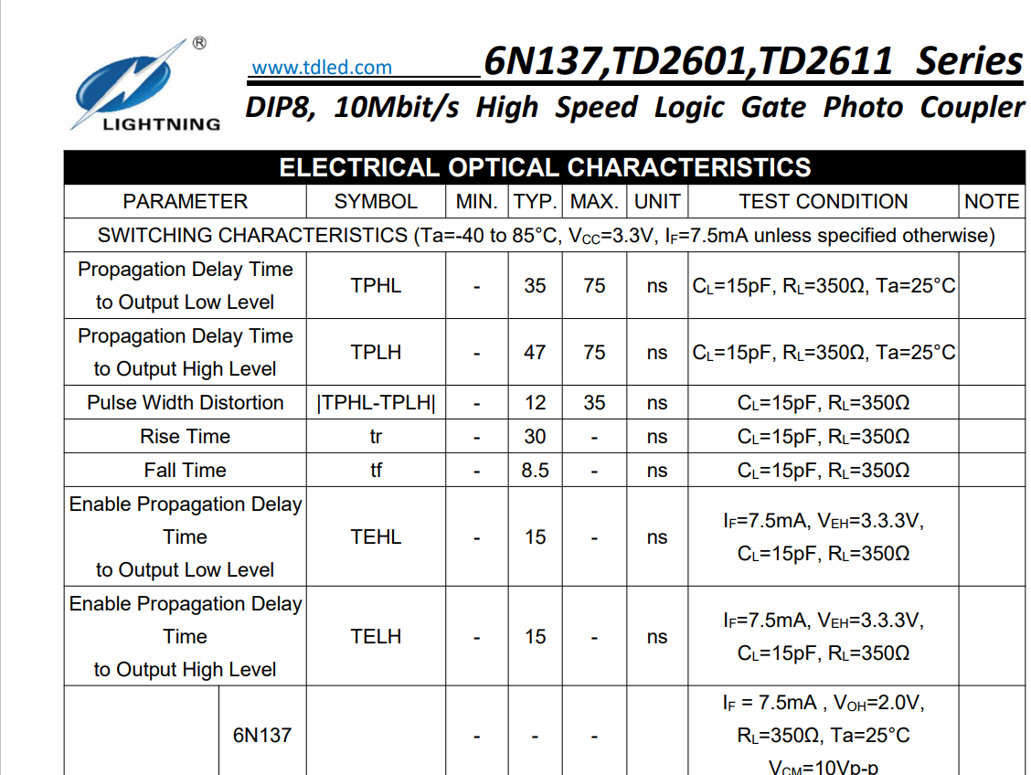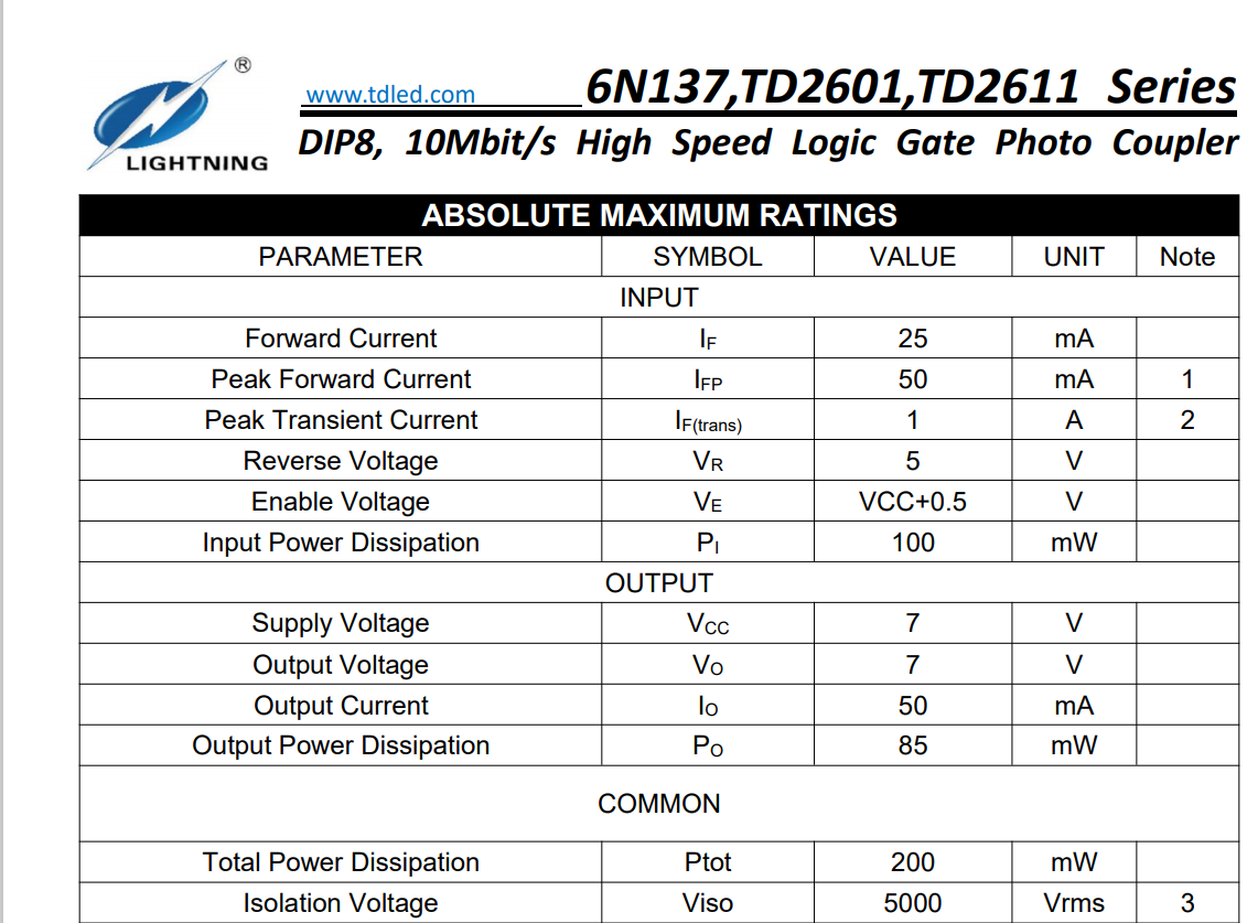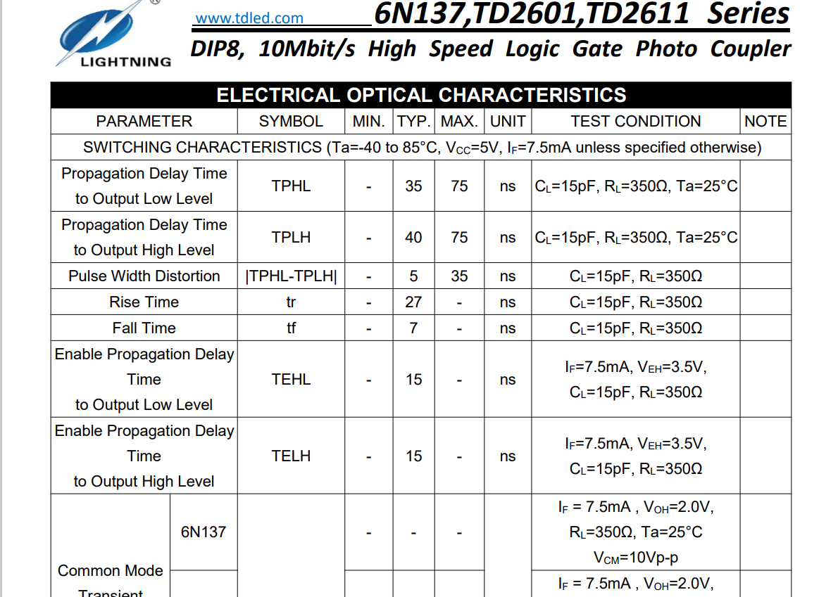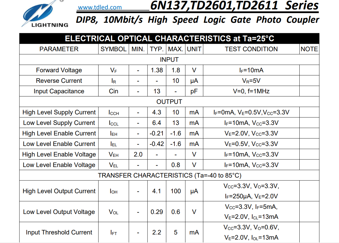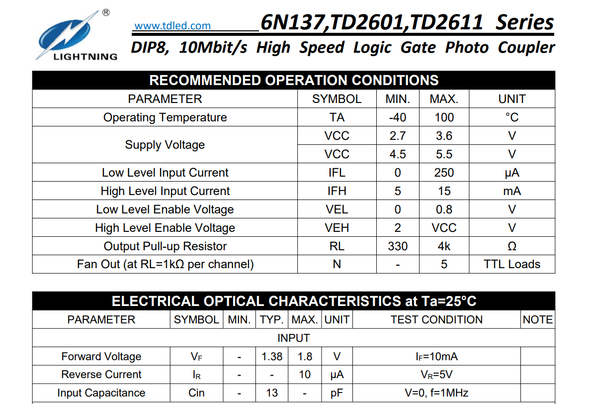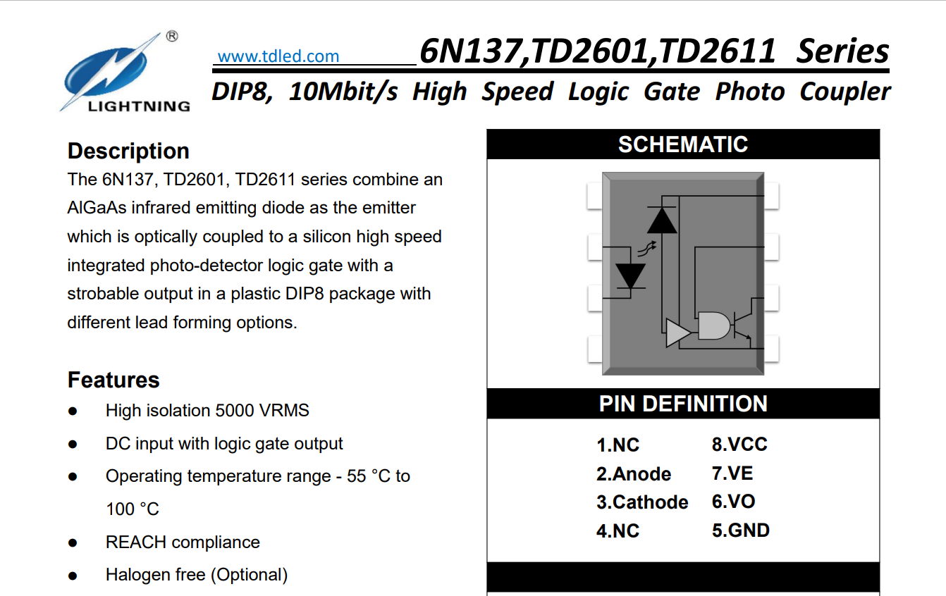 天電6N137屬于單通道八個(gè)腳高速光耦,速率在10Mbit/s,輸出Vcc為7V,耐壓5000VRMS,工作溫度:-55℃TO 100℃;體積為9.76*6.6*3.6MM;在使用性能上能替代夏普PC910L0NSZ0F,東芝TLP552/554,安華高HCPL-260L/2611/2601/2612/7601/7611,仙童HCPL-2601/2611,威世VO2601/2611;瑞薩PS8501,封裝的類型分為貼片SMD8和插件DIP8,其內(nèi)部850nm波長(zhǎng)的AlGaAs LED 光學(xué)耦合到一個(gè)高速的集成光電檢測(cè)器, 該輸出具有一個(gè)開路集電極,可進(jìn)行集電極開路輸出。廣泛的應(yīng)用于:LSTTL 換 TTL, LSTTL 或 5V CMOS,線路接收器,數(shù)據(jù)傳輸,數(shù)據(jù)多路復(fù)用,開關(guān)電源,脈沖變壓器更換,計(jì)算機(jī)外設(shè)接口;?