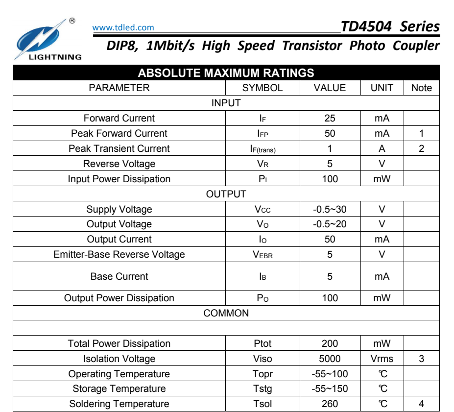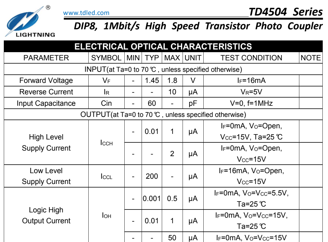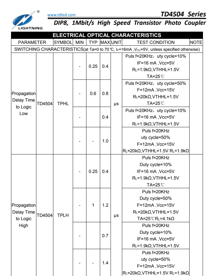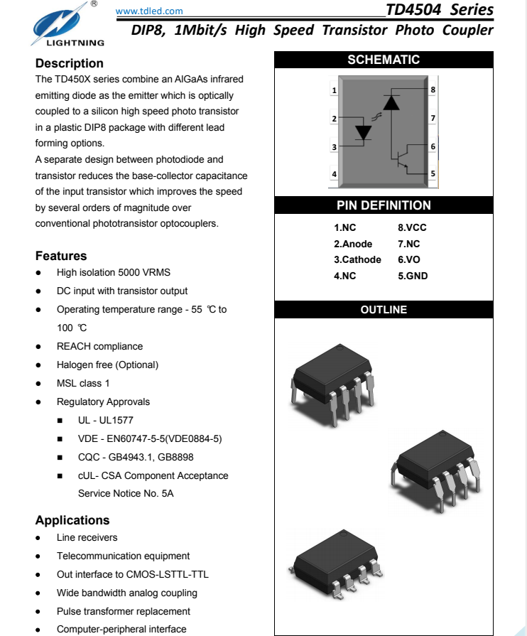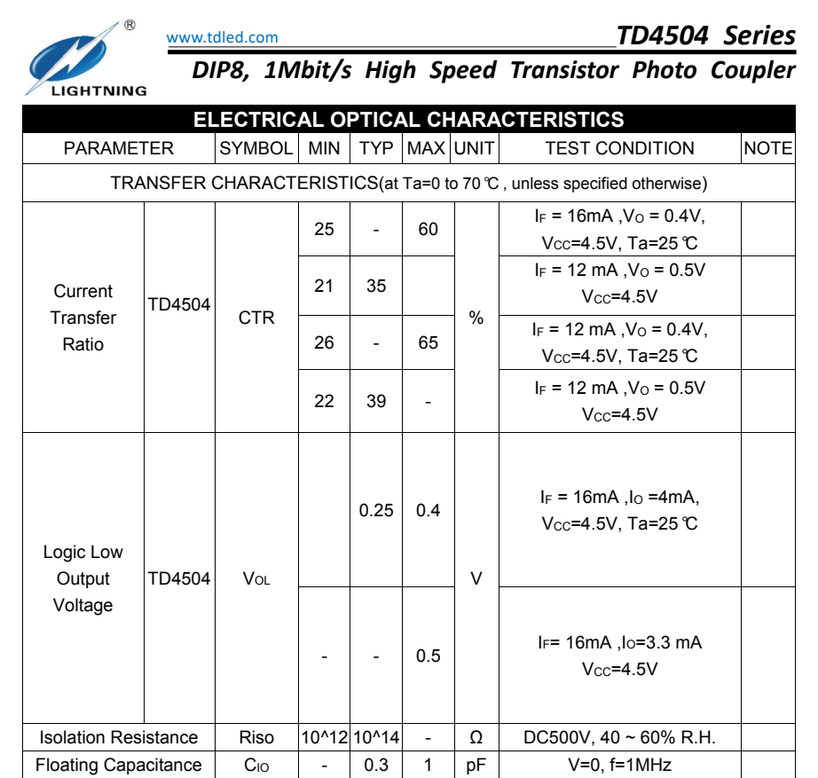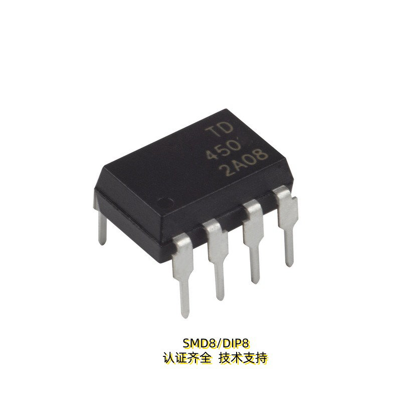 天電TD4504為8腳智能功率模塊接口光耦I(lǐng)PM,速率為1Mbit/s,輸入電流為25MA,輸出電壓Vcc為-0.5V-30V,耐壓為5000VRMS,體積為9.76*6.6*3.5MM,工作溫度:-55℃TO 100℃ 封裝的類型分為貼片SMD8和插件DIP8,在使用性能上能替代億光EL4054,安華高HCPL-4504,威世SFH6345,主要運用于線路接收機(jī),電信設(shè)備,CMOS-LSTL-TTL的輸出接口,寬帶模擬耦合脈沖變壓器更換,計算機(jī)外圍接口。