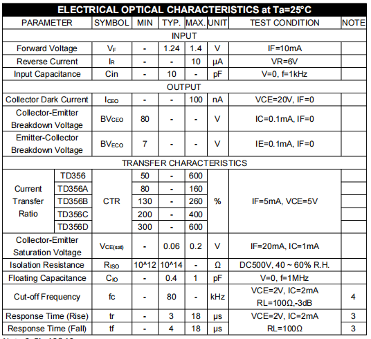 詳細(xì)信息- 天電TD356屬于SOP4三極管類(lèi)型光耦,耐壓3750 VRMS,工作溫度:-55℃TO 110℃,輸出電壓為80V,輸入正向電流IF60MA,尺寸為:4.4*3.6*2.1MM,在使用性能上能替代億光EL357, 光寶LTV352T/356T/357T,兆龍CT357,夏普PC356/357/352/367,以及東芝TLP121/124/185/181,冠西KPC357NT,安華高HCPL-181,瑞薩PS2732-1/PS2761-1/2711-1/2703-1/2701-1, 威世SFH690XT/SFH692AT,仙童FODM121/124/2701;CTR值分別是A檔為80-160,B檔130-260,C檔200-400 D檔300-600,主要運(yùn)用于家電系統(tǒng),測(cè)量?jī)x器;寄存器,復(fù)印機(jī),自動(dòng)售貨機(jī);家用電器,如風(fēng)扇、加熱器等; 不同阻抗間的信號(hào)傳輸。?