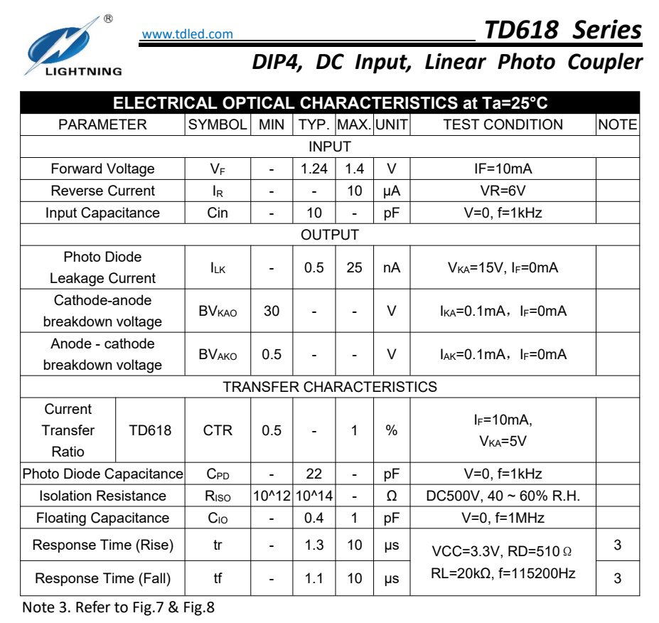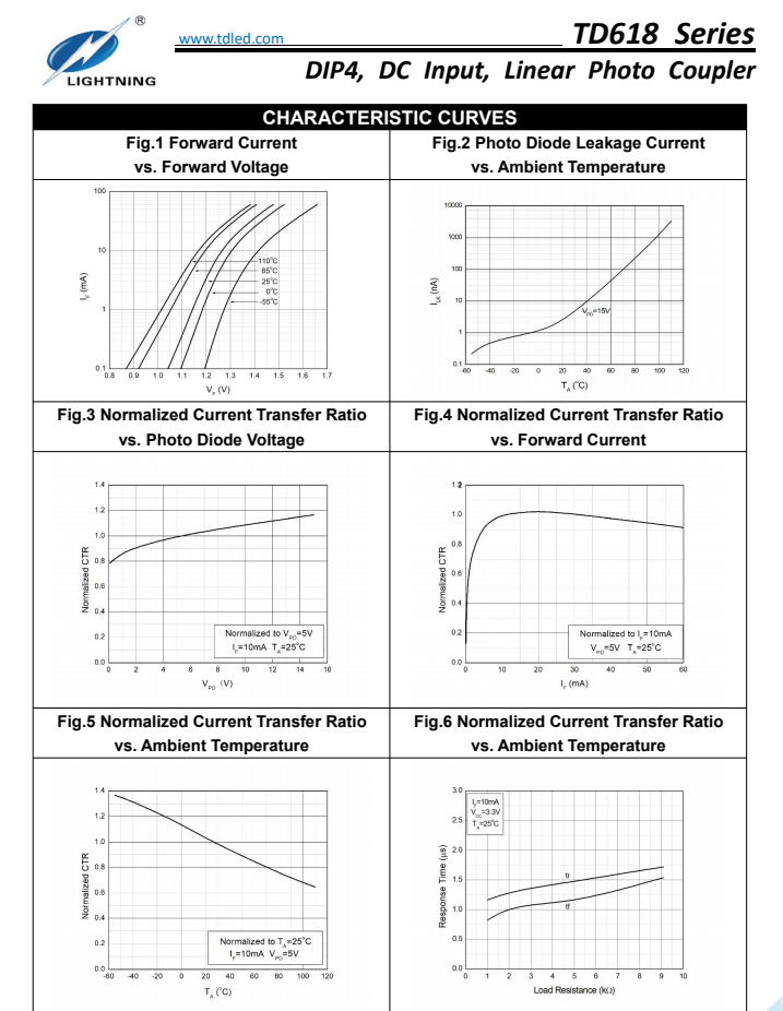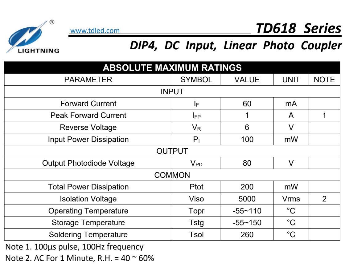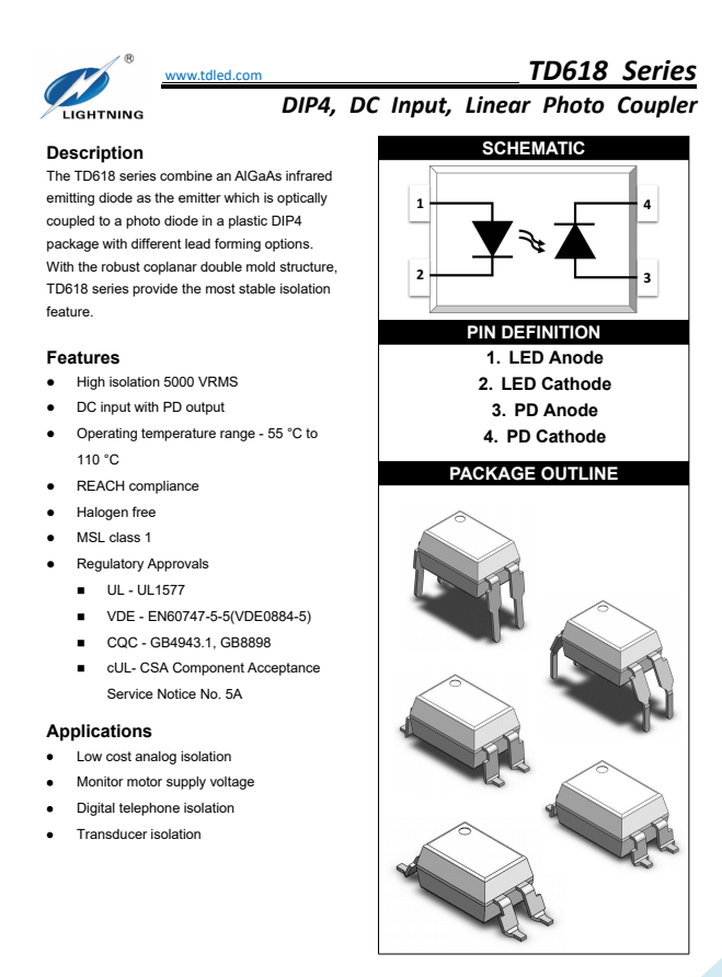 天電TD618為四個腳直流輸入線性光耦,耐壓為5000VRMS,工作溫度:-55℃TO 110℃,輸入電流IF60MA,輸出電壓為80V,體積為6.5*4.58*3.5MM,CTR值為0.5-1%,封裝類型分為貼片SMD4和插件DIP4,TD618系列具有堅固的共面雙模結(jié)構(gòu),提供最穩(wěn)定的隔離,廣泛的運用于低成本模擬隔離,監(jiān)視器電機電源電壓,數(shù)字電話隔離,傳感器;