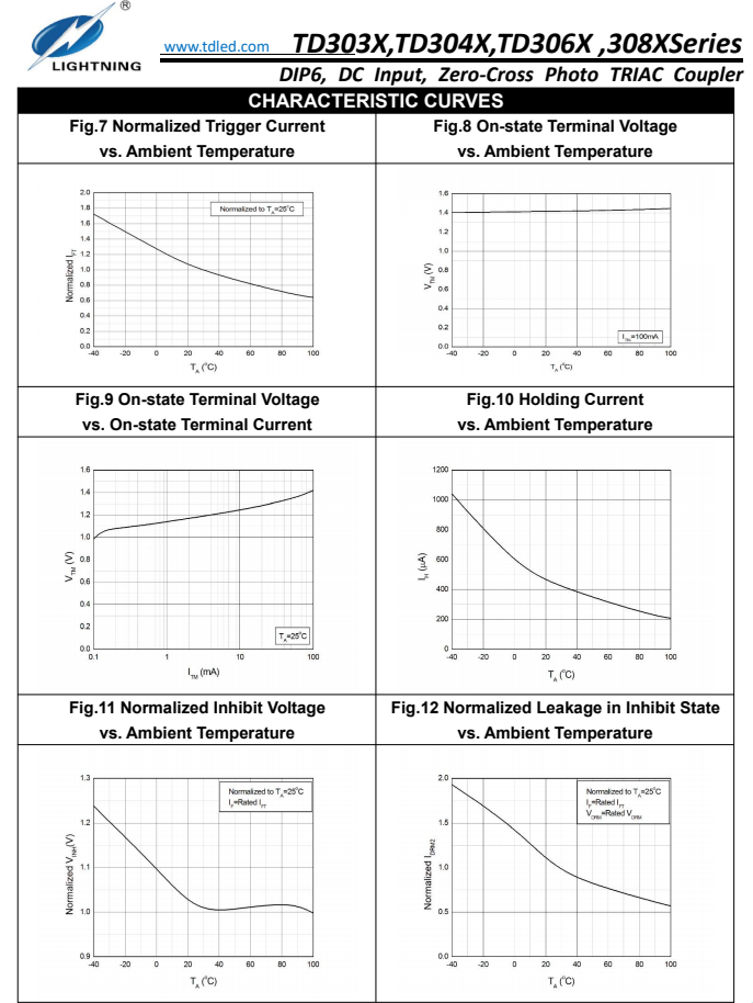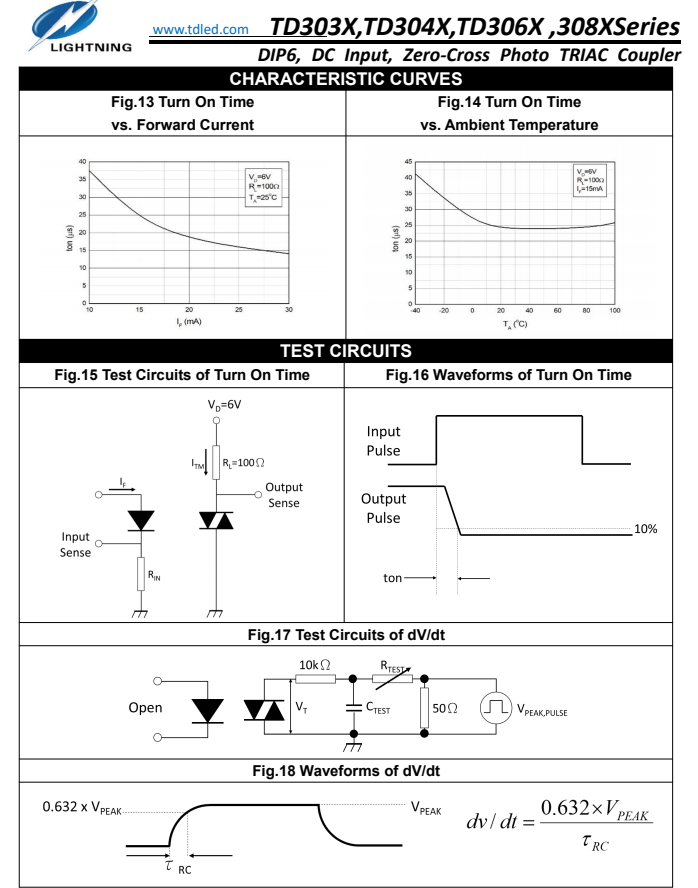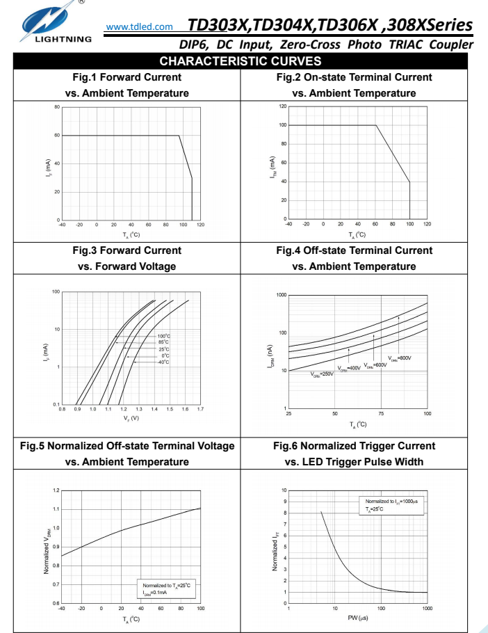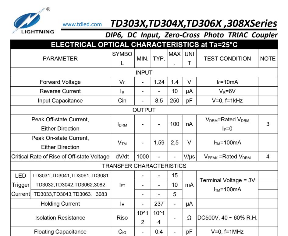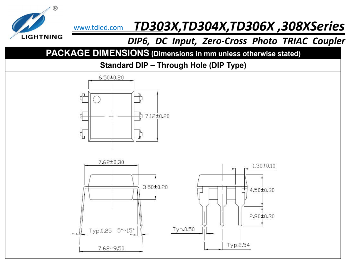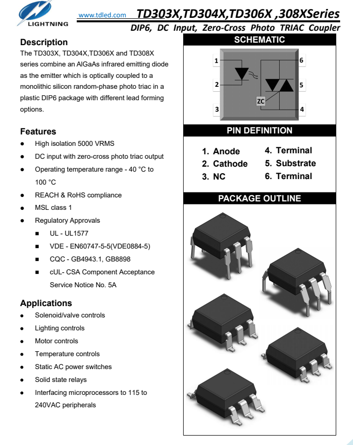 天電光耦TD308X屬于6個腳雙向光可控硅過零觸發(fā)型(ZC)光耦,封裝為SMD6/DIP6,耐壓5000VRMS,輸出電壓為800V,觸發(fā)電流TD3041為15MA,TD3042為10MA,TD3043為5MA;封裝尺寸7.12*6.5*3.5MM,工作溫度:-40℃TO 100℃ 在使用性能上能替代億光EL3081/3082/3083,光寶MOC3081/3082/3083,兆龍CT3081/3082/3083,,夏普PCSD21X,冠西KMOC3081/3082/3083,東芝TLP666L/669L,仙童MOC3081M/3082M/3083M,可使用雙向可控硅光耦去控制雙向可控硅的導通,用以驅動電機,燈源等負載,并且可實現(xiàn)調速調光等功能。 在控制與驅動領域,雙向可控硅光耦應用非常廣泛;溫度控制,電機控制,白熾燈調光器,交流電源開關,電磁閥控制等;