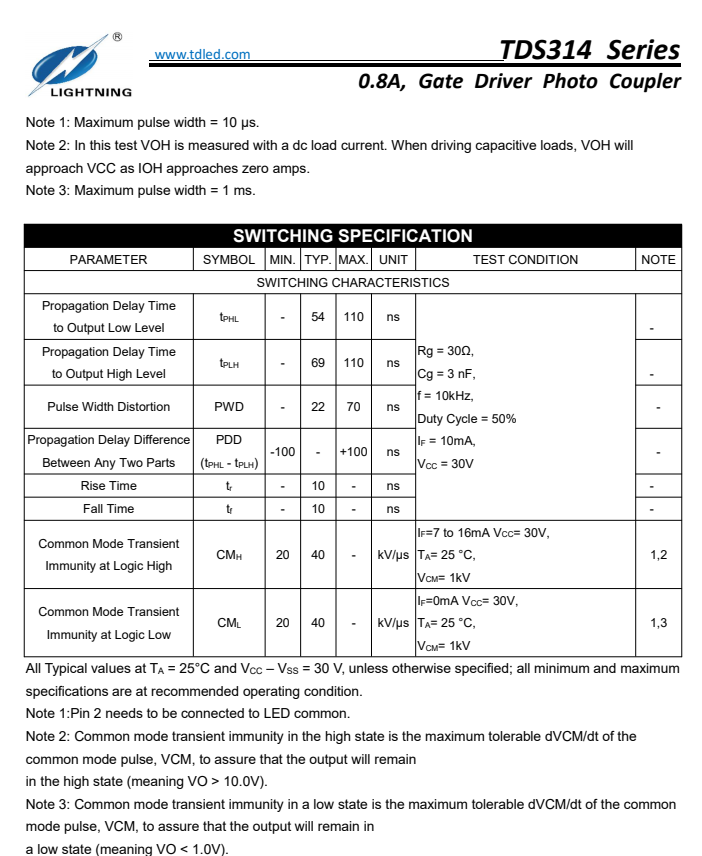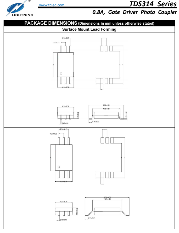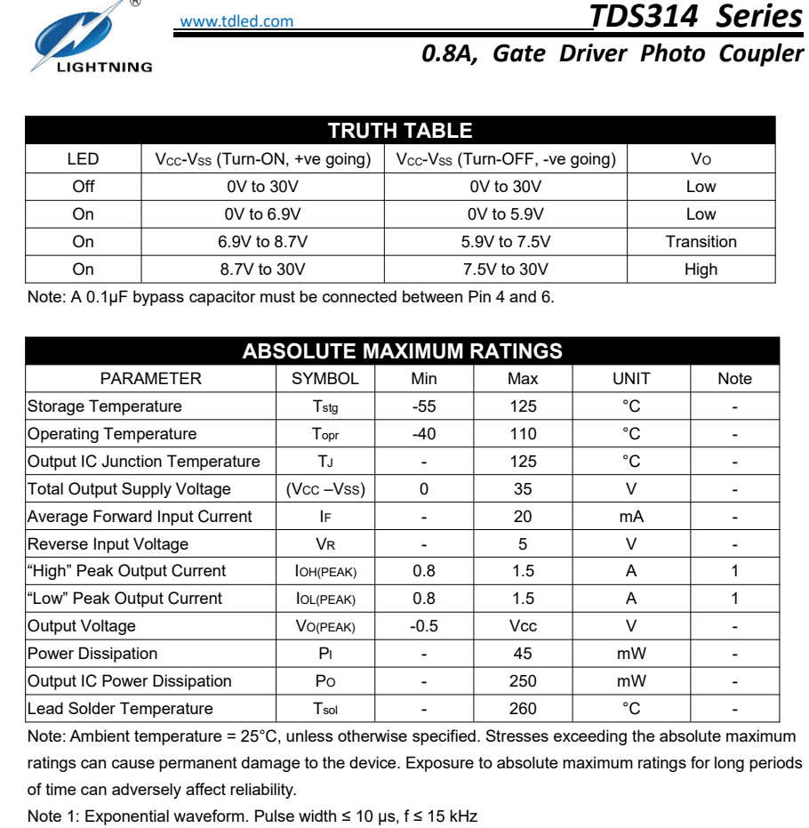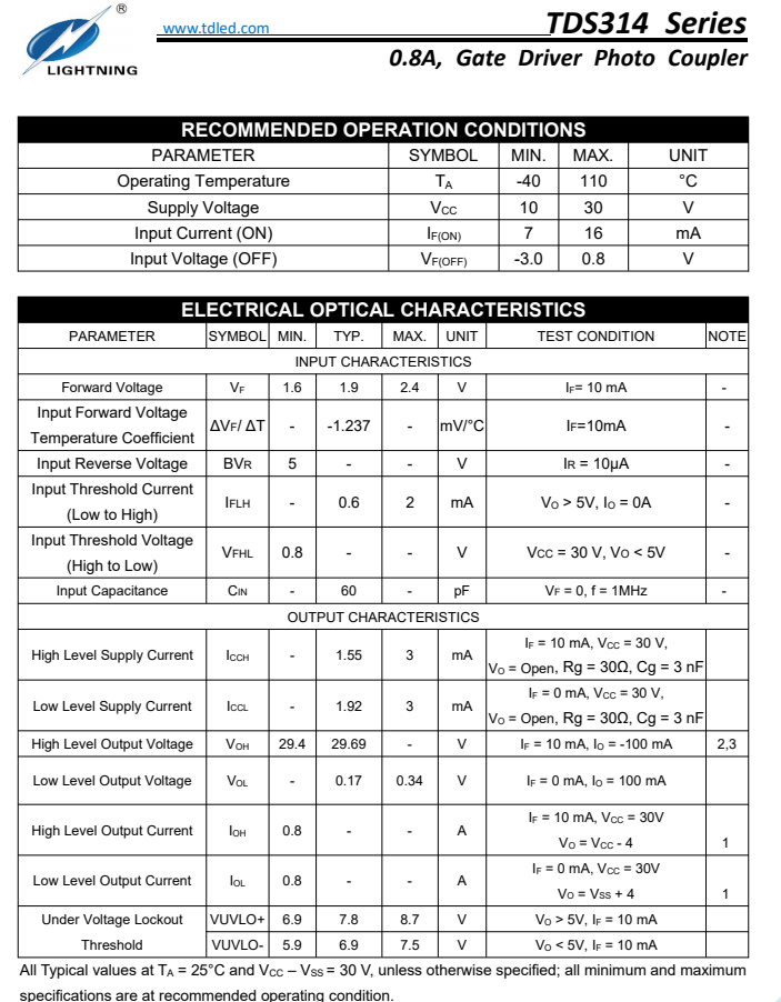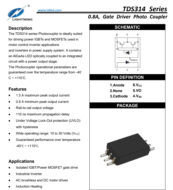 天電TDS314為SOP6 IGBT閘極驅(qū)動(dòng)光耦,1.5A最大峰值輸出電流,0.8A最小峰值輸出電流,TDS314系列光電耦合器非常適合驅(qū)動(dòng)用于電機(jī)控制逆變器應(yīng)用和電源系統(tǒng)逆變器的功率IGBT和MOSFET。它包含一個(gè)AlGaAs LED,光耦合到帶有功率輸出級(jí)的集成電路。工作參數(shù)在-40°C~+110°C的溫度范圍內(nèi)得到保證,可替代安華高ACPL-P314/ACPL-R314/ACPL-W314,仙童FOD8314,東芝TLP701,光寶TLV-314,隔離電壓為5000Vrms,電源電壓額定值寬至 10 至30V,廣泛運(yùn)用于開(kāi)關(guān)電源,IGBT/MOSFET 柵極驅(qū)動(dòng),交流和無(wú)刷直流電機(jī)驅(qū)動(dòng),可再生能源逆變器,工業(yè)逆變器;詳詢(xún)羅生:18925289962