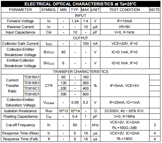 詳細(xì)信息 - 天電TD816屬于光三極管類型光耦,耐壓為5000VRMS,輸出電壓80V,輸入電流60MA,尺寸為6.5*4.58*3.5MM,工作溫度:-55℃TO 110℃在使用性能上能替代億光EL816,光寶LTV-816,兆龍CT816,夏普PC121/PC816,東芝TLP421/621/781/785,仙童HHA617,瑞薩PS2501/2521/2561/2571/2581,威世SFH61X/TCET1100,松下CNC1S101,封裝的類型分為SMD4和DIP4,電流傳輸比CTR值分為四個檔,分別為A檔:80-160%,B檔:130-260%,C檔:200-400%,D檔:300-600%;運用于開關(guān)電源,智能電表,工業(yè)控制,測量儀器,目的在于增加安全性,減小電路干擾,減化電路設(shè)計;?