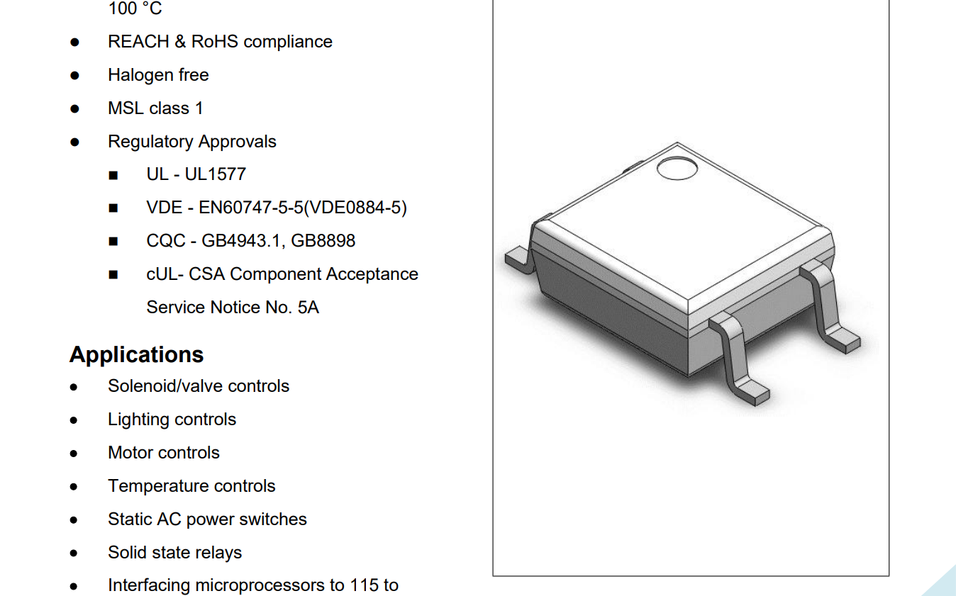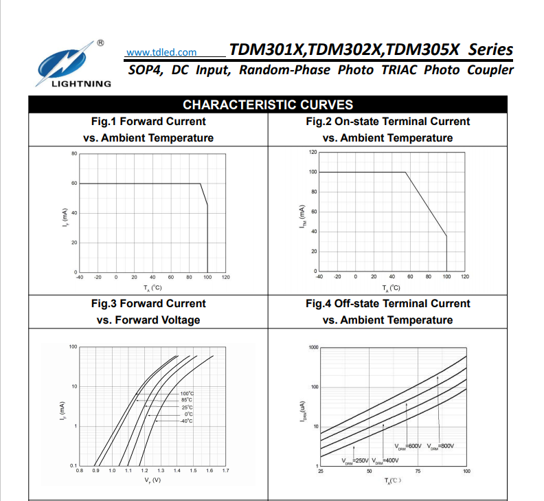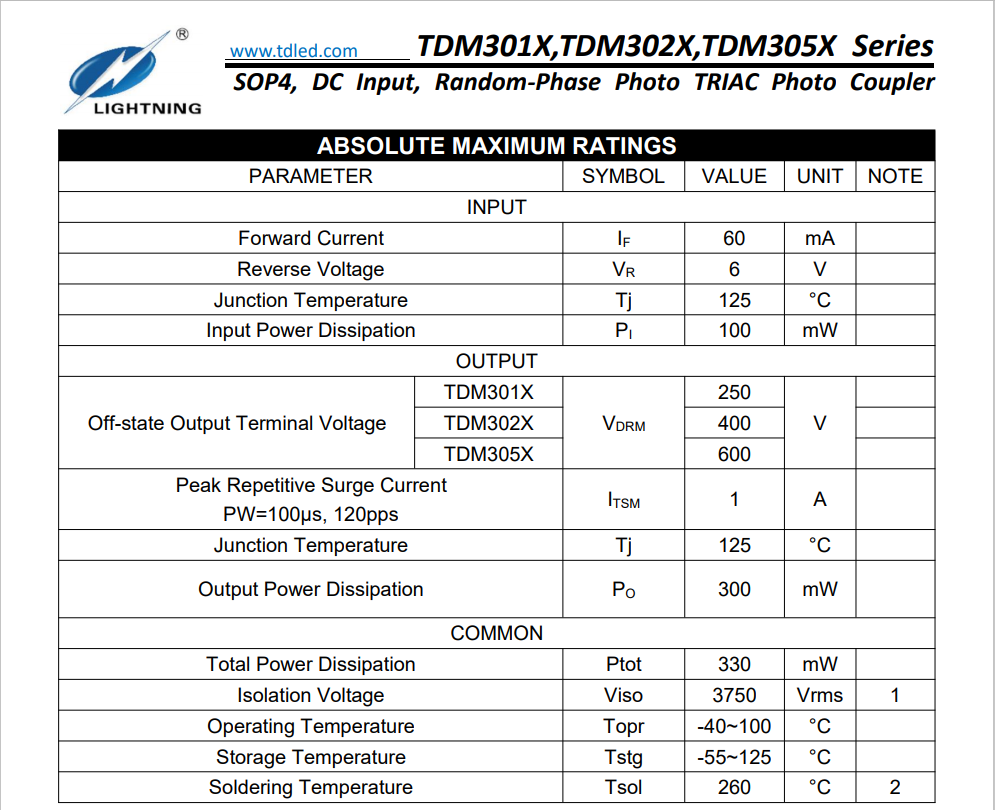 天電光耦TDM302X屬于小體積SOP4雙向光可控硅隨機(jī)觸發(fā)型(RP)光耦,耐壓3750VRMS,輸出電壓為400V,觸發(fā)電流TDM3021為15MA,TDM3022為10MA,TDM3023為5MA.輸入電流為60MA,封裝尺寸為4.4*3.6*2.1MM,工作溫度:-40℃TO 100℃,在使用性能上能替代億光ELM3021/3022/3023,光寶LTV-3021/3022/3023,兆龍CTM3021/3022/3023,東芝TLP160G,冠西KTLP160G,仙童FODM3021/3022/3023,可使用雙向可控硅光耦去控制雙向可控硅的導(dǎo)通,用以驅(qū)動(dòng)電機(jī),燈源等負(fù)載, 并且可實(shí)現(xiàn)調(diào)速調(diào)光等功能。在控制與驅(qū)動(dòng)領(lǐng)域,雙向可控硅光耦應(yīng)用非常廣泛;溫度控制,電機(jī)控制,白熾燈調(diào)光器,交流電源開關(guān),電磁閥控制