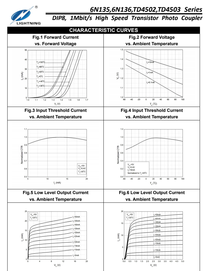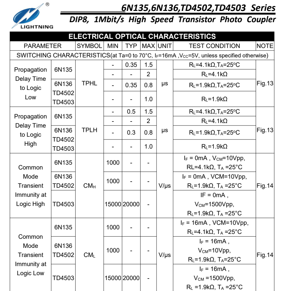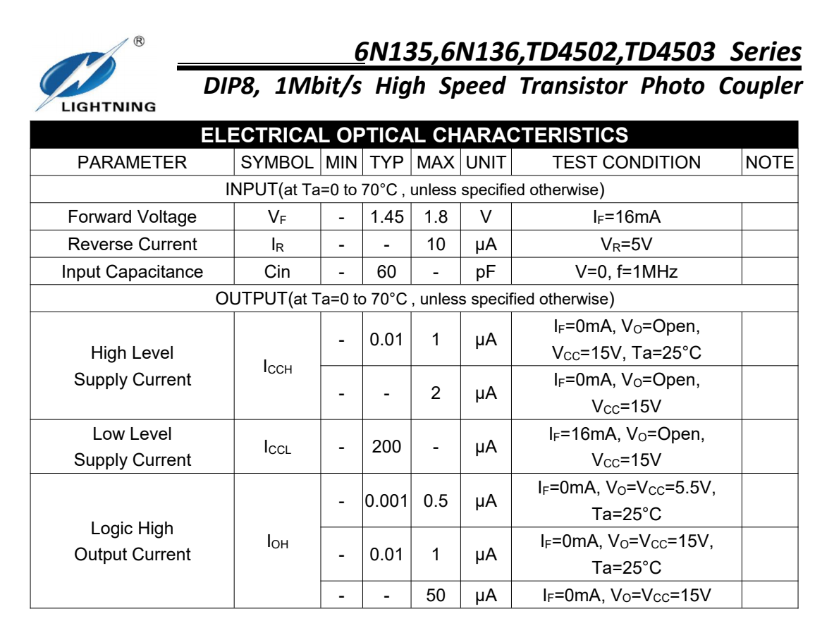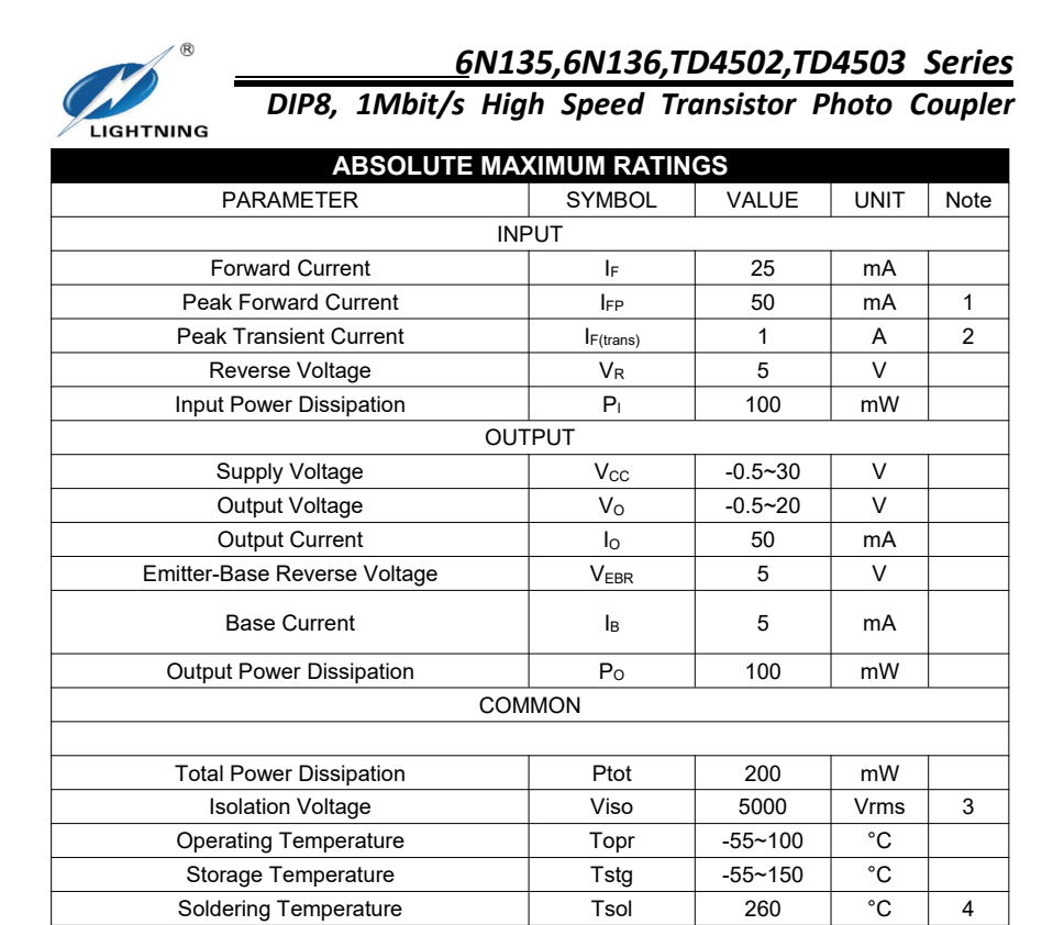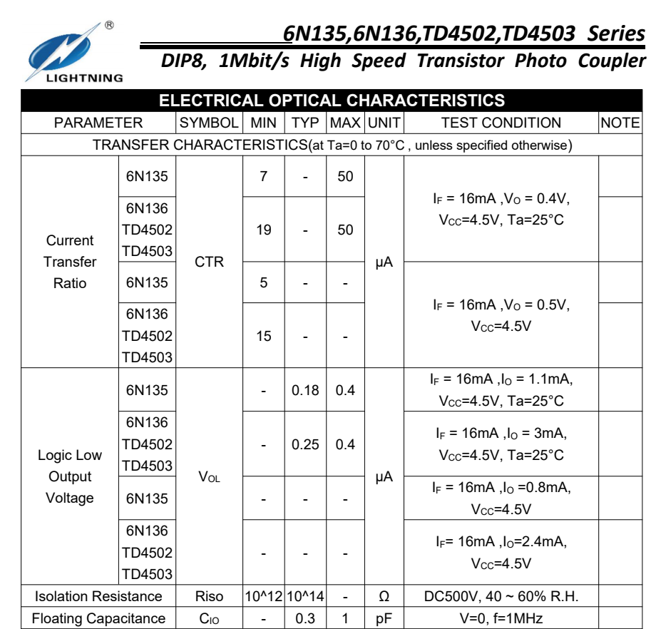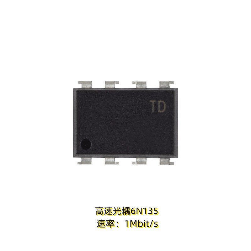 天電6N135屬于單通道八個腳高速光耦,速率在1Mbit/s,輸入電流IF25MA,輸出Vcc為-0.5-30V,耐壓5000VRMS,工作溫度:-55℃TO 100℃;尺寸為:9.76*6.6*3.5MM, 由一個850nm波長的AlGaAs LED 光耦合到高速光電探測器晶體管組成,在使用性能上能替代夏普6N135,兆龍6N135,億光6N135,東芝TLP551/651/751/,安華高6N135,仙童6N135,威世SFH6135/6N135; 封裝的類型分為貼片SOP8和插件DIP8,廣泛的應(yīng)用于:輸出接口至CMOS-LSTTL-TTL,電信設(shè)備,電機驅(qū)動器中的功率晶體管隔離; 詳詢羅生:18925289962