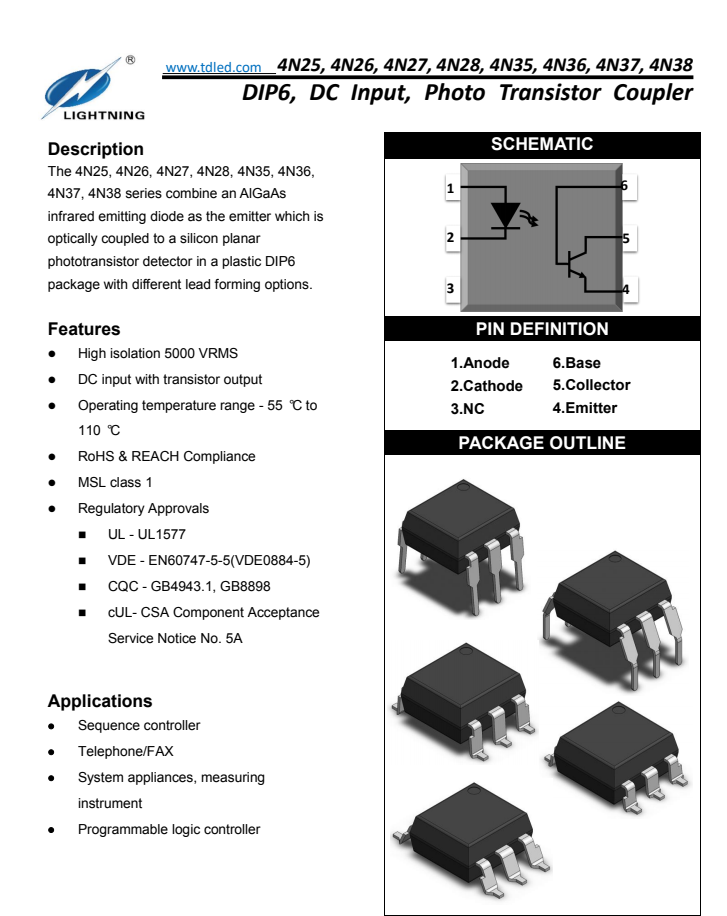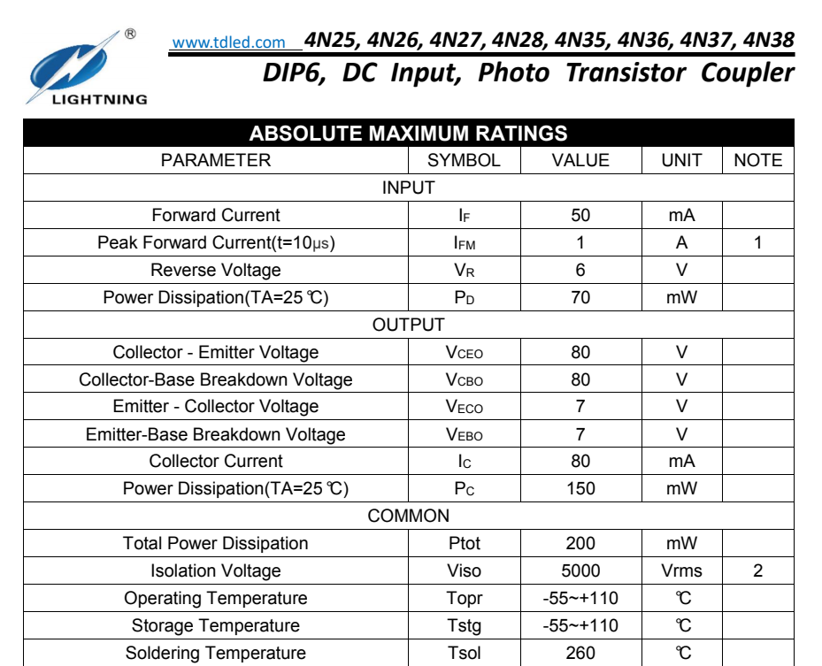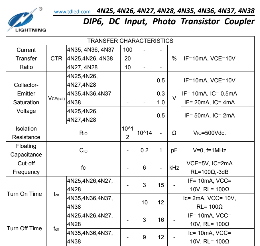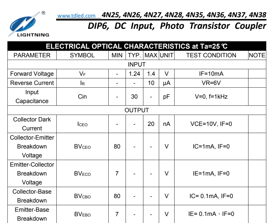 天電TD4N35為6腳光三極管光耦,耐壓為5000VRMS,輸入電流IF為50MA,輸出電壓為80V,工作溫度:-55℃TO 110℃,體積為7.12*6.5*3.5MM,封裝類(lèi)型分為貼片SMD6和插件DIP6, CTR值為100%以上,主要運(yùn)用于順序控制器,系統(tǒng)設(shè)備,測(cè)量?jī)x器,可編程邏輯控制器;