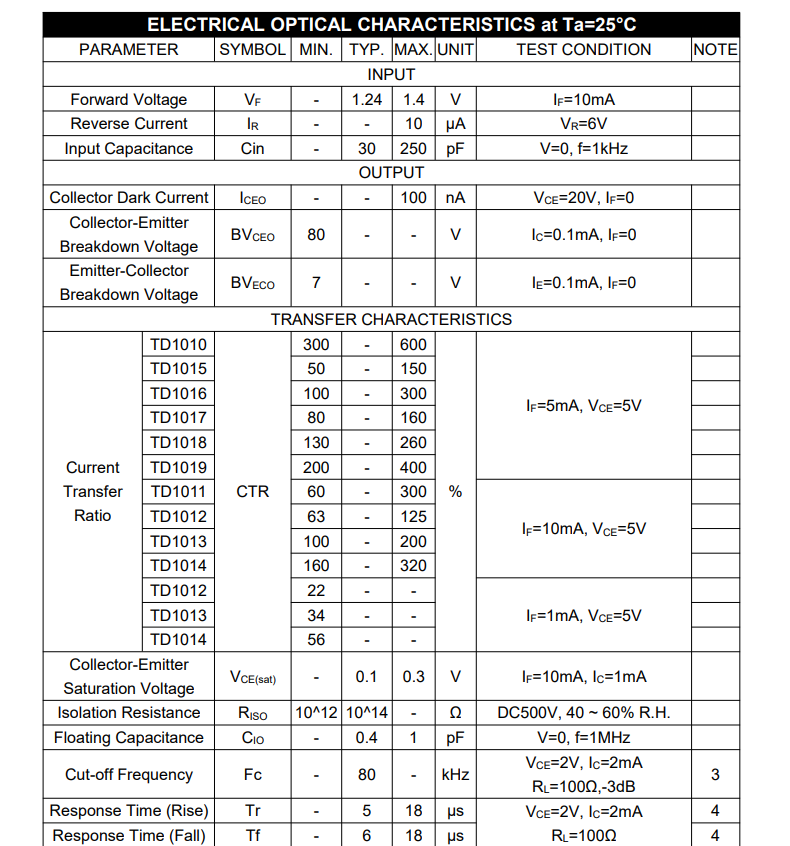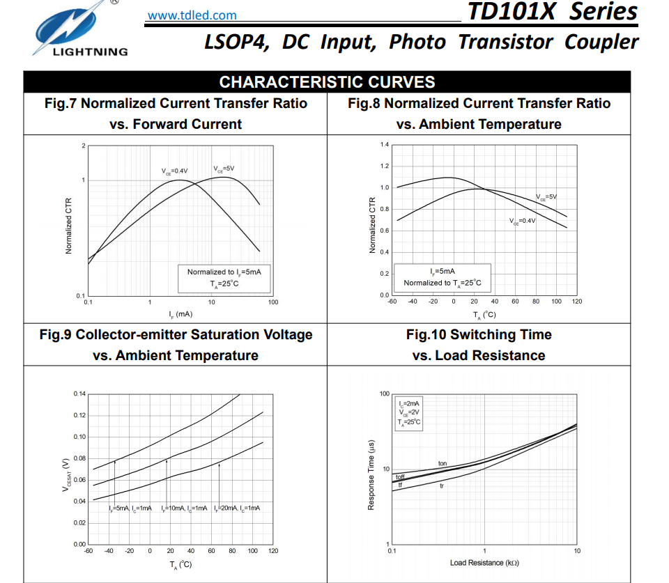 天電TD1015屬于LSOP4光三極管光耦,耐壓5000 VRMS,輸出電壓為80V,輸入正向電流IF50MA,尺寸:7.6*3.6*2.0;電流傳輸比CTR值為:50-150%,工作溫度為:-55℃TO 110℃, 在使用性能上能替代東芝TLP10383/TLP383/TLP385,億光EL1015,光寶LTV-1005,兆龍CT1015,瑞薩PS2381-1,威世TCLT1015/VOL617A/VOL618A,仙童FODM100x/FODM819, 主要運用于各類型快充,電源反饋電路 系統(tǒng)裝置,測試儀器 寄存器,復印機,自動售貨機 家用電器; 詳詢羅生:18925289962
