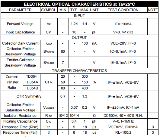 詳細(xì)信息 - 天電TD354屬于SOP4交流輸入三極管雙向光耦,耐壓3750 VRMS,輸出電壓為80V,尺寸4.4*3.6*2.1MM,工作溫度:-55℃TO 110℃,在使用性能上能替代億光EL354,光寶LTV354T,兆龍CT354,夏普PC354/356, 東芝TLP120/180/182/126,,冠西KPC354NT,安華高HCPL-354,仙童HMA2705,瑞薩PS2705-1/2715-1/2765-1,威世SFH691AT;封裝類型為貼片,CTR值分別是A檔為50-150,B檔80-400,以及20-300;主要應(yīng)用于開關(guān)電源,智能電表,工業(yè)控制器,交流/直流輸入模塊,辦公設(shè)備;?
