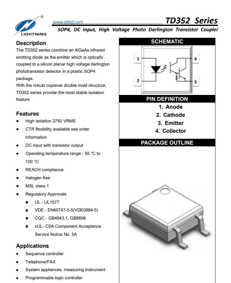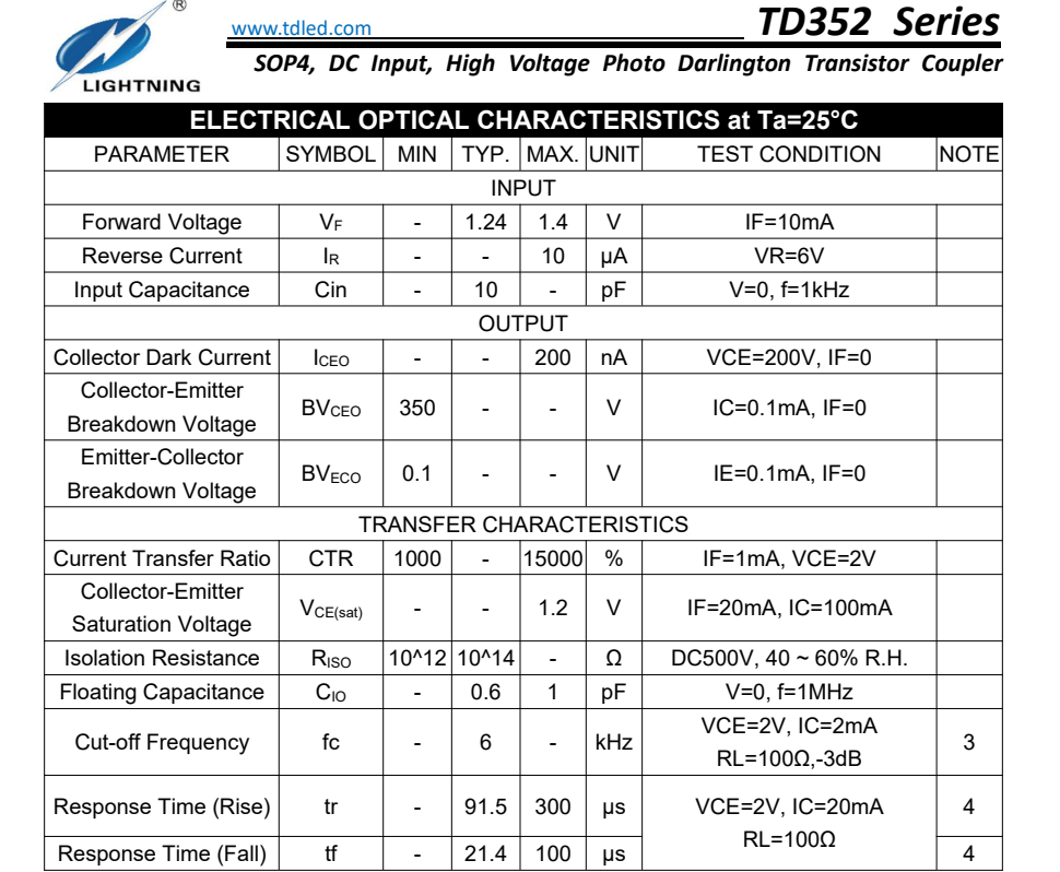 天電TD352屬于SOP4高壓達靈頓管光耦,耐壓3750VRMS,輸出電壓350V,輸入電流IF60MA,尺寸4.4*3.6*2.1MM,工作溫度:-55℃TO 100℃,在使用性能上能替代億光EL452,光寶LTV-352T,兆龍CT452, 夏普PC352/452,東芝TLP187/127,瑞薩PS2732-1/2733-1,仙童FODM352,CTR值為1000-15000%,主要運用于通訊設(shè)備 ,可編程控制器 ,信號傳輸 ,工業(yè)控制,測量儀器;?