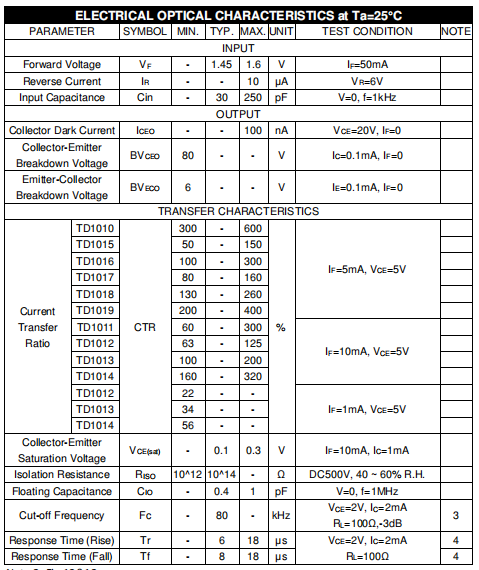 天電TD1018屬于LSOP4光三極管光耦,耐壓5000 VRMS,輸出電壓為80V,輸入正向電流IF50MA,尺寸:7.6*3.6*2.0MM;電流傳輸比CTR值為:130-260%,工作溫度為:-55℃TO 110℃,在使用性能上能替代東芝TLP10383/TLP383/TLP385,億光EL1018,光寶LTV-1008,兆龍CT1018,瑞薩PS2381-1,威世TCLT1018/VOL617A/VOL618A,仙童FODM100x/FODM819, 主要運用于各類型快充,電源反饋電路 系統(tǒng)裝置,測試儀器 寄存器,復印機,自動售貨機 家用電器,比如風扇、熱水器等