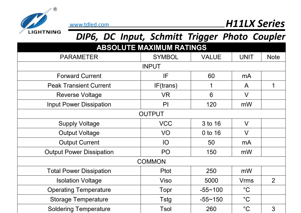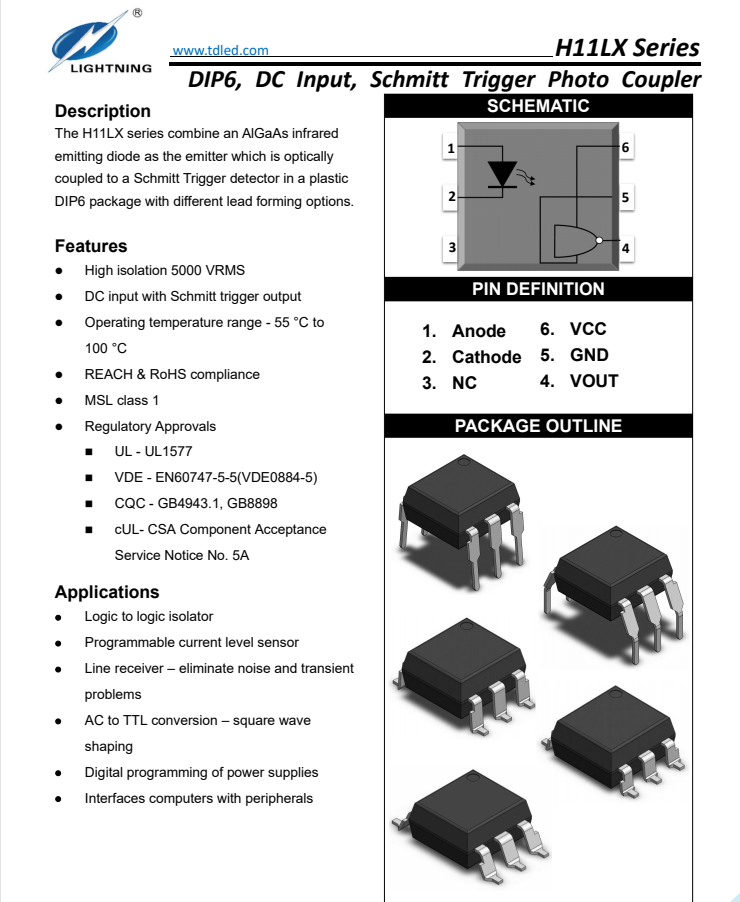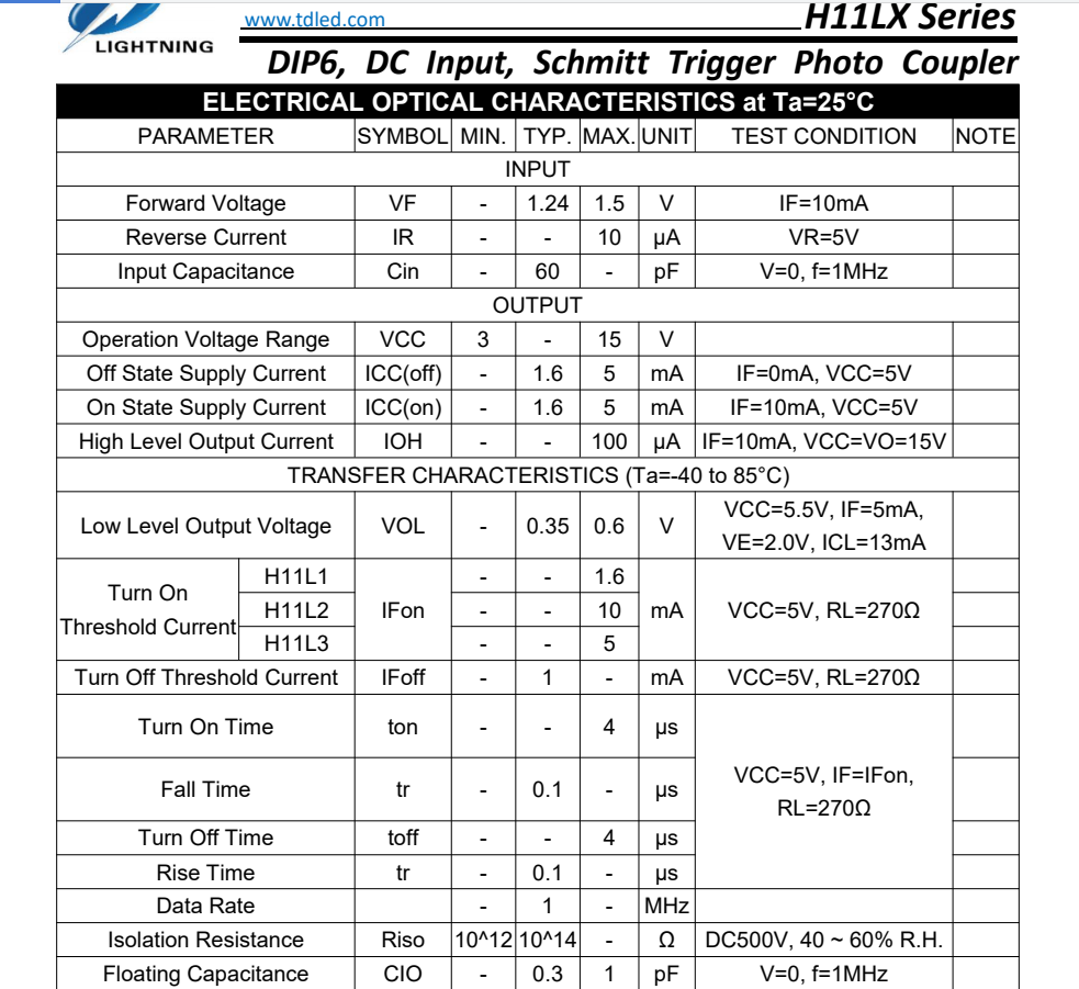 天電TDH11L1為6腳施密特觸發(fā)型光耦,耐壓5000VRMS,輸出電壓VCC: 3V TO 16V,輸入電流IF60MA,尺寸6.5*4.58*3.5MM,工作溫度:-55℃TO 100℃,接通閾值電流為:1.6MA,應用于? 邏輯到邏輯隔離器,可編程電流水平傳感器,線路接收器–消除噪聲和瞬態(tài)交流到TTL轉(zhuǎn)換-方波塑造,電源的數(shù)字編程,計算機與外圍設備的接口;?
